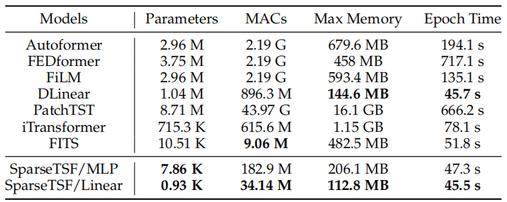 表4. SparseTSF与其他主流模型在Traffic数据集上的静态与运行时指标对比