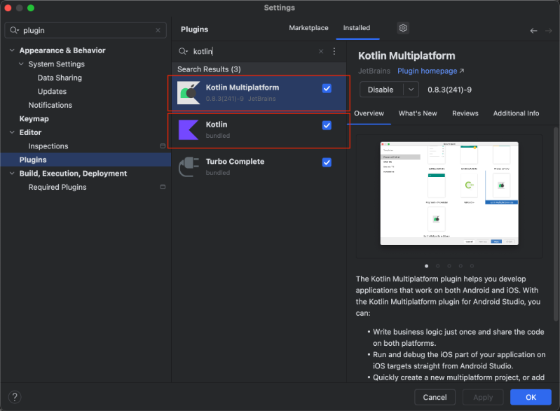 1.在Android Studio中安装Kotlin和Kotlin MultiPlatform插件,路径为Setting->Preferences->Plugins->Marketplace