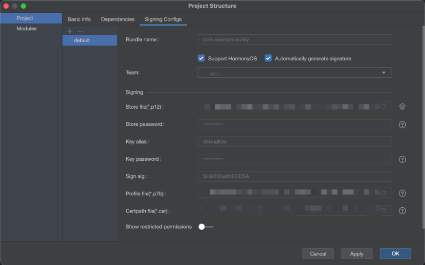 在运行之前App之前,需要执行签名操作 File -> Project Structure -> Signing Configs