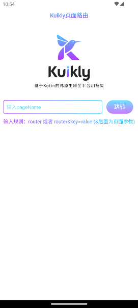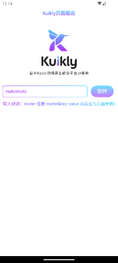 }我们以Android平台作为效果演示,运行androidApp, 在Kuikly路由页面输入我们加在HelloWorldPage上的注解名字HelloWorld,最后点击跳转