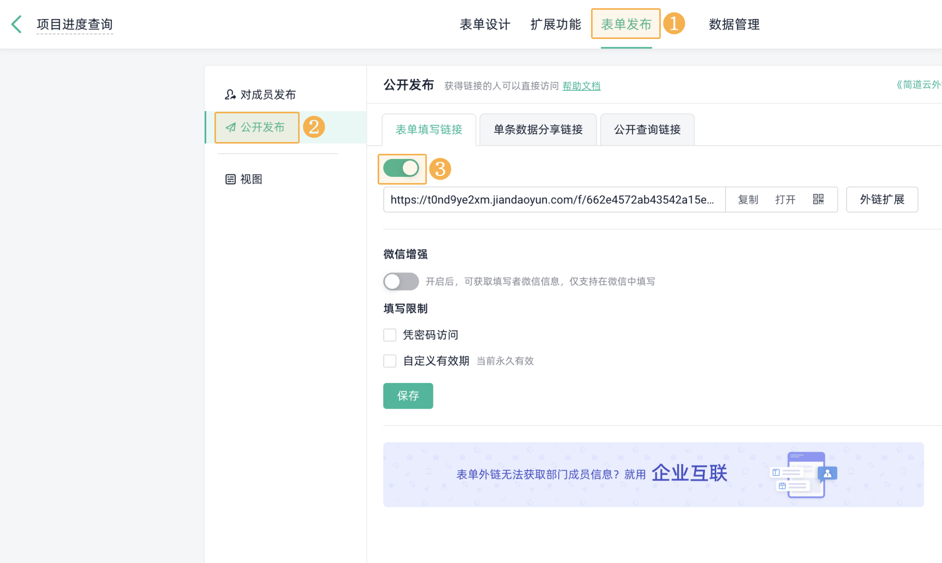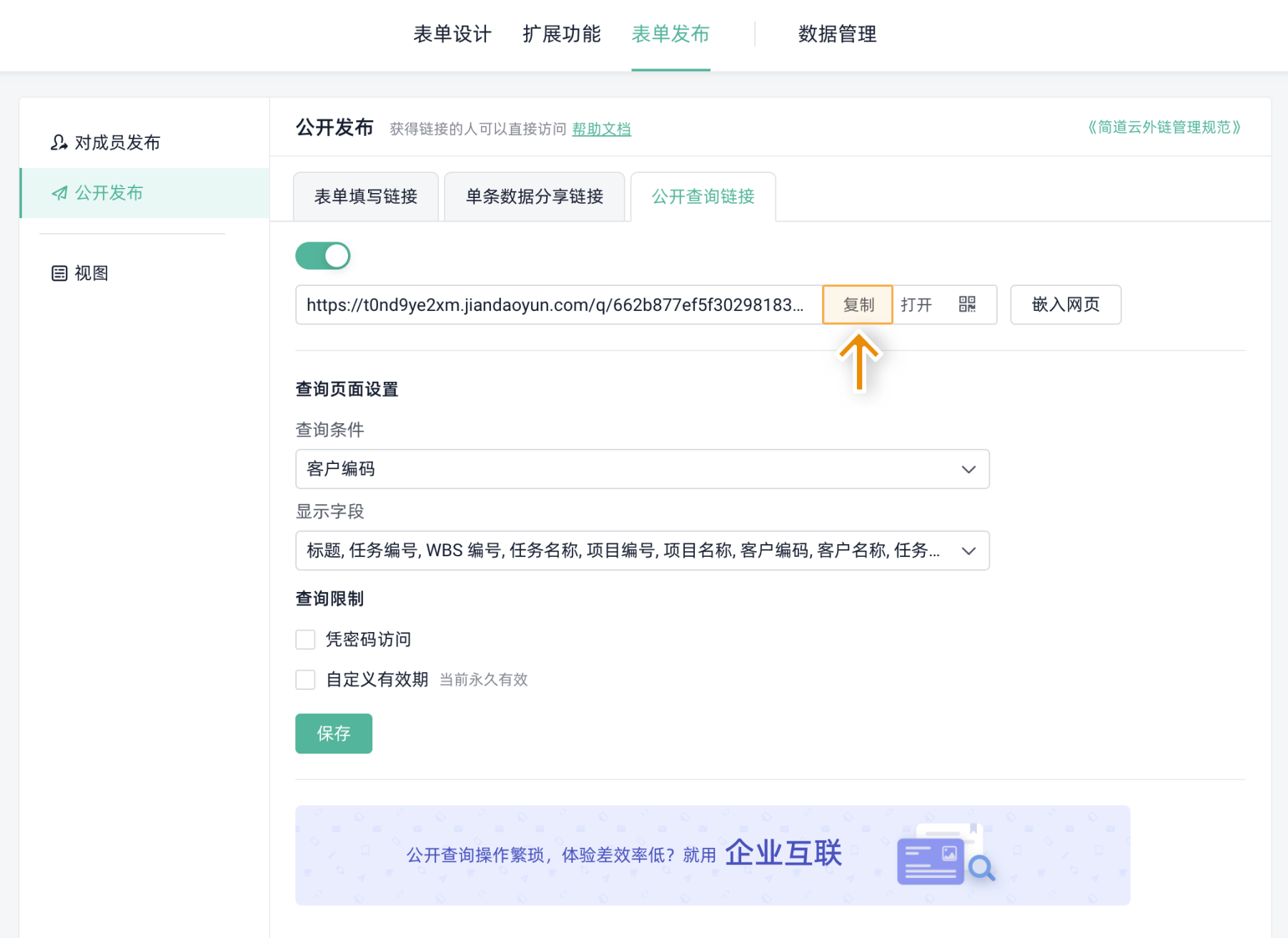跨表查询是通过创建一张独立的查询表单,作为客户查询项目信息的入口。这种方式操作简单,界面美观,适合需要对外展示企业形象的场景。