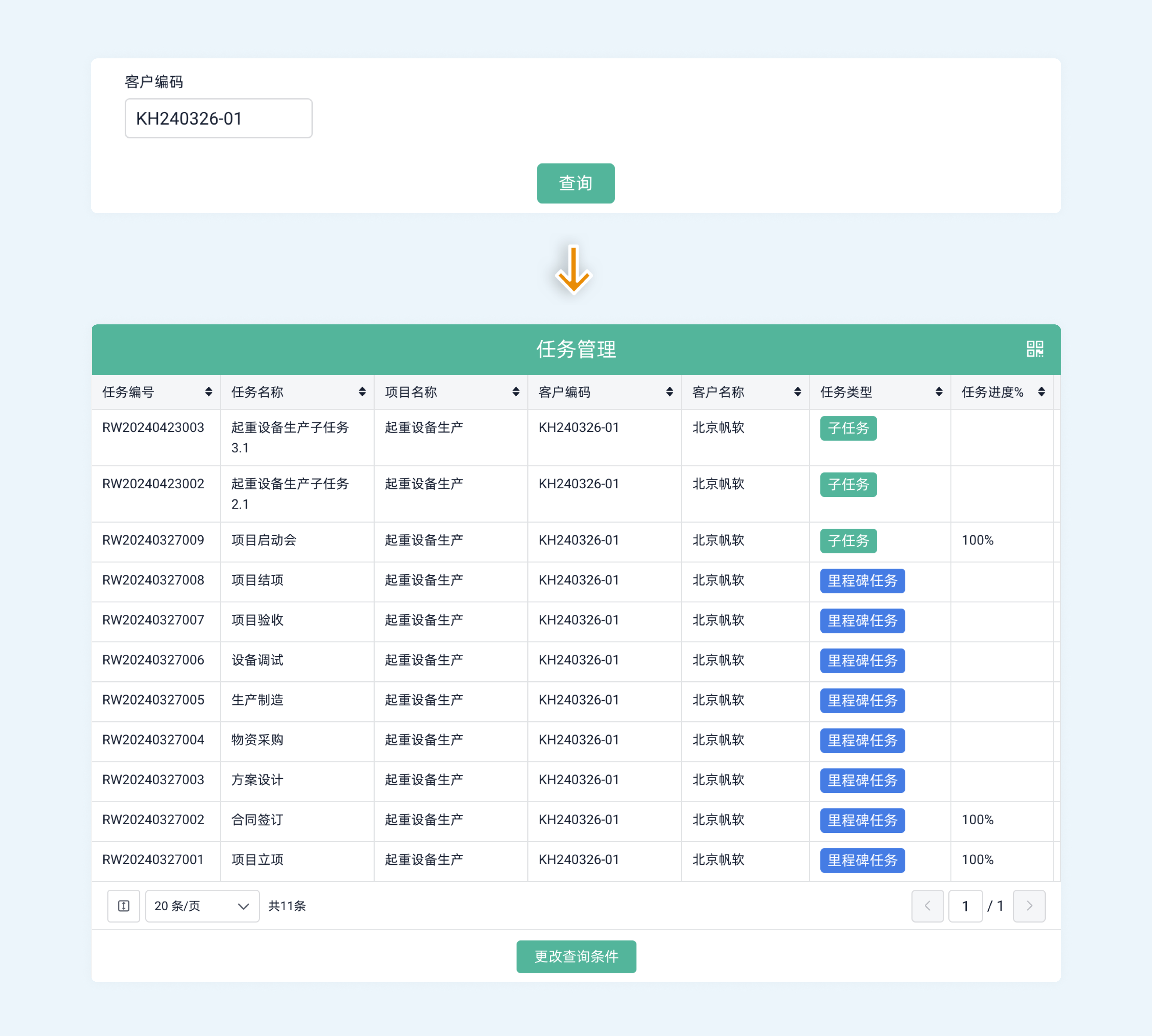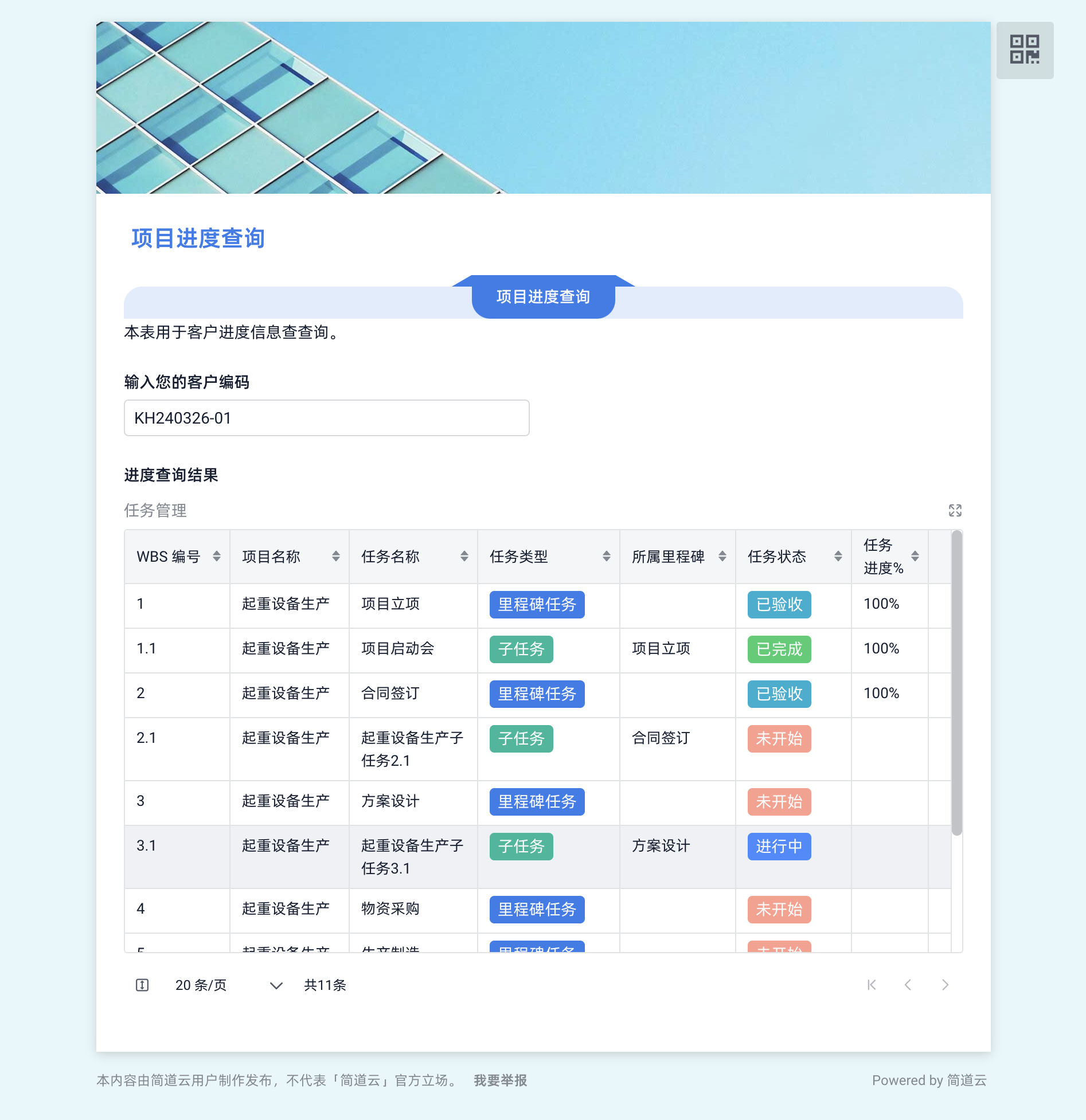 实际效果: 客户点击查询链接,输入客户编码,即可看到所有关联项目的实时进度,无需等待项目团队整理数据。