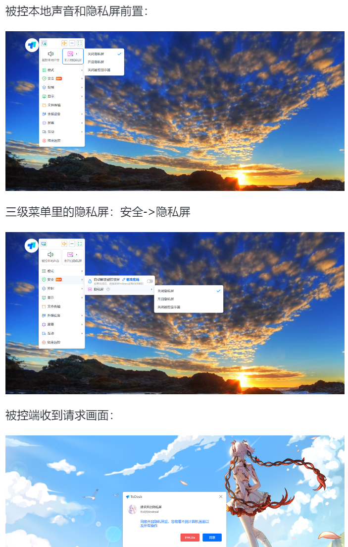 接着在主控端选择开启隐私屏,实操演示如下。不支持被控端自行退出“隐私屏”。