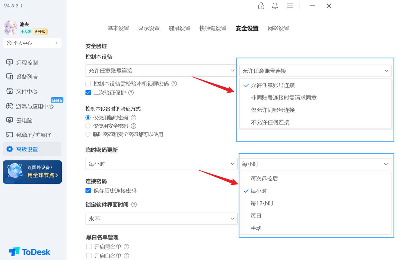 ==ToDesk:安全设置高度可定制化,构建了以主设备为核心的多重安全保障体系==