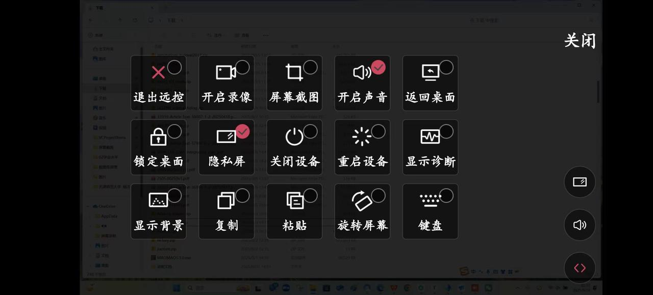 向日葵的隐私屏不支持任何快捷键启动,也不支持自定义亮屏时长等高级设置。这意味着,每一次启用和关闭都必须依赖鼠标点击深层菜单。这在需要频繁切换显示状态的工作中,显得尤为低效和笨拙。另外“开/关声音”功能也在向日葵的远控菜单中。