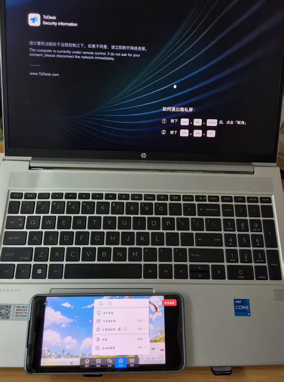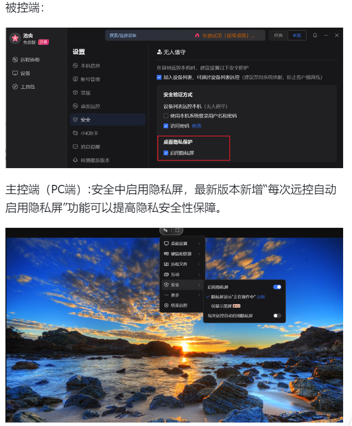 被控端(PC端)壁纸显示,不支持被控端自行退出“隐私屏”,灵活性不足。