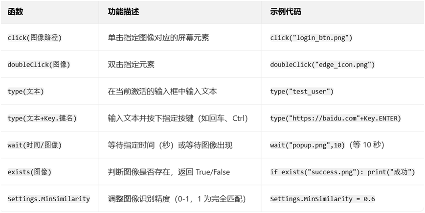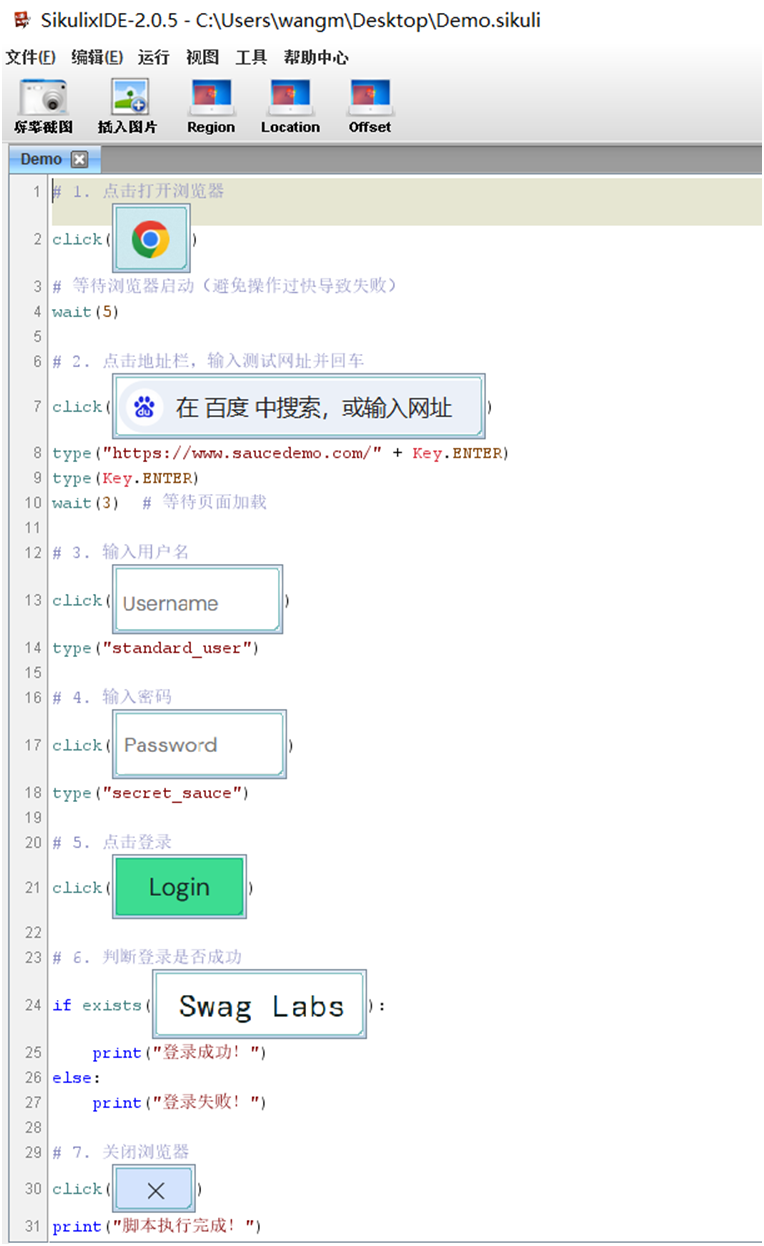 SikuliX默认使用Python语法,可实现“定位 - 操作 - 判断”的完整自动化逻辑。