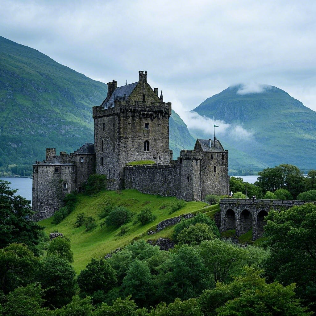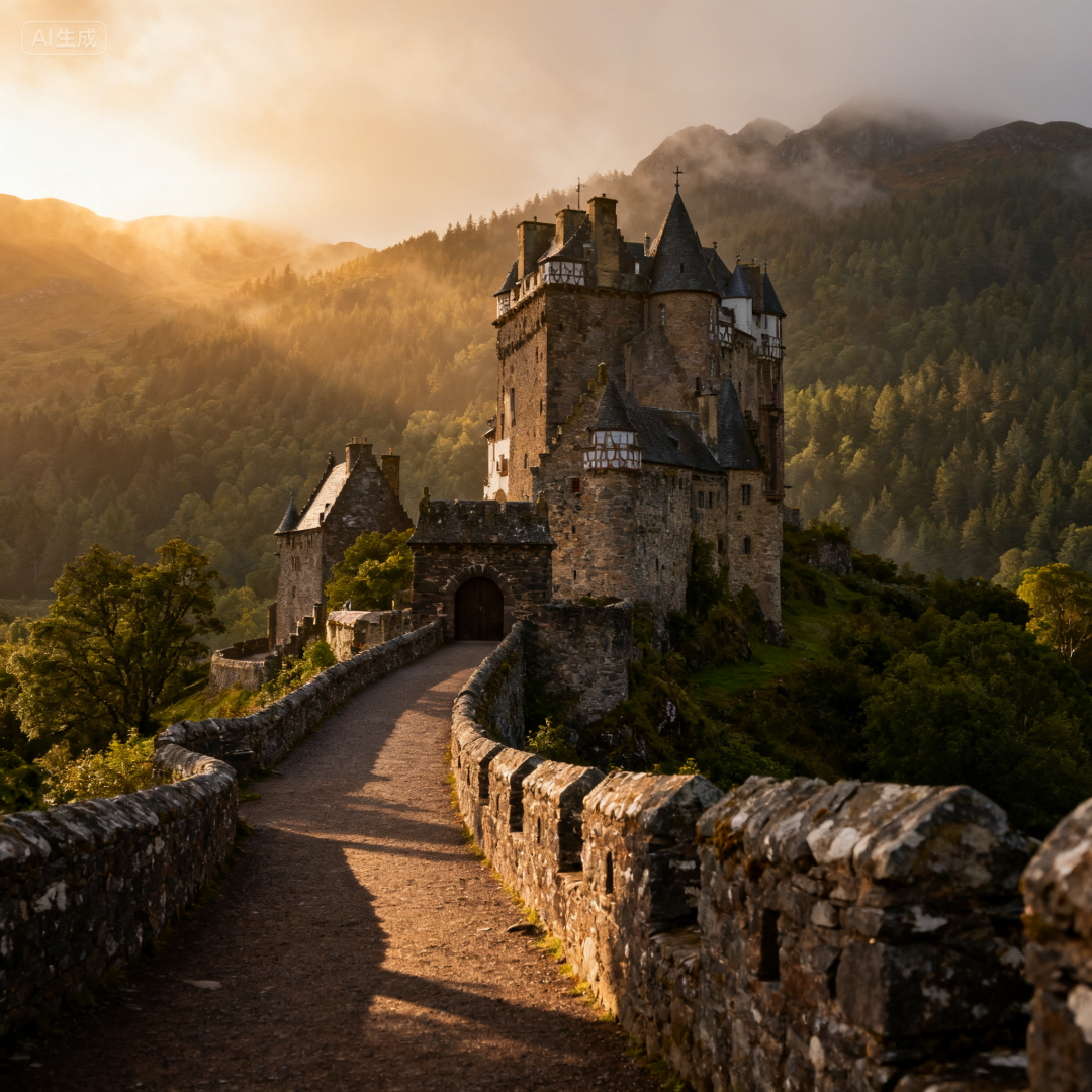 prompt2:苏格兰高地的一座中世纪城堡,被郁郁葱葱的绿色植被、雾蒙蒙的山脉和历史氛围所环绕。