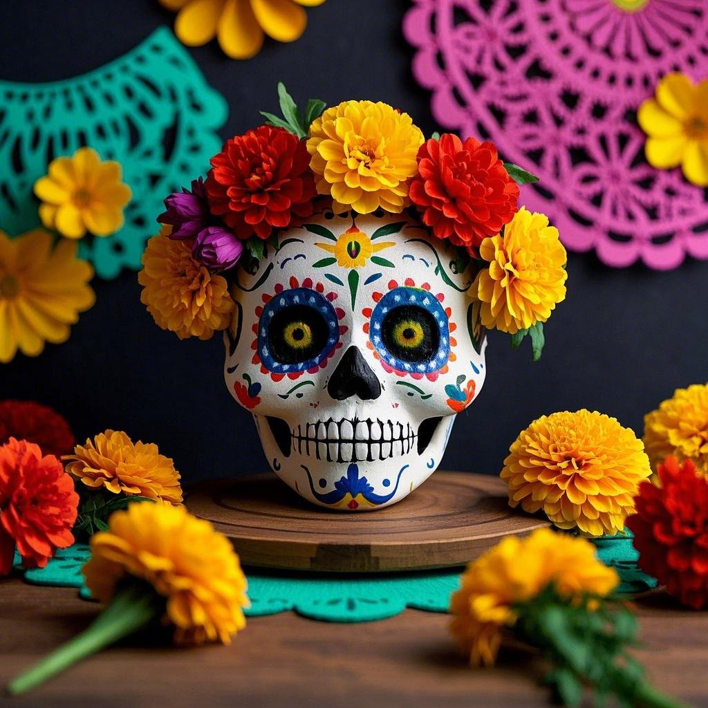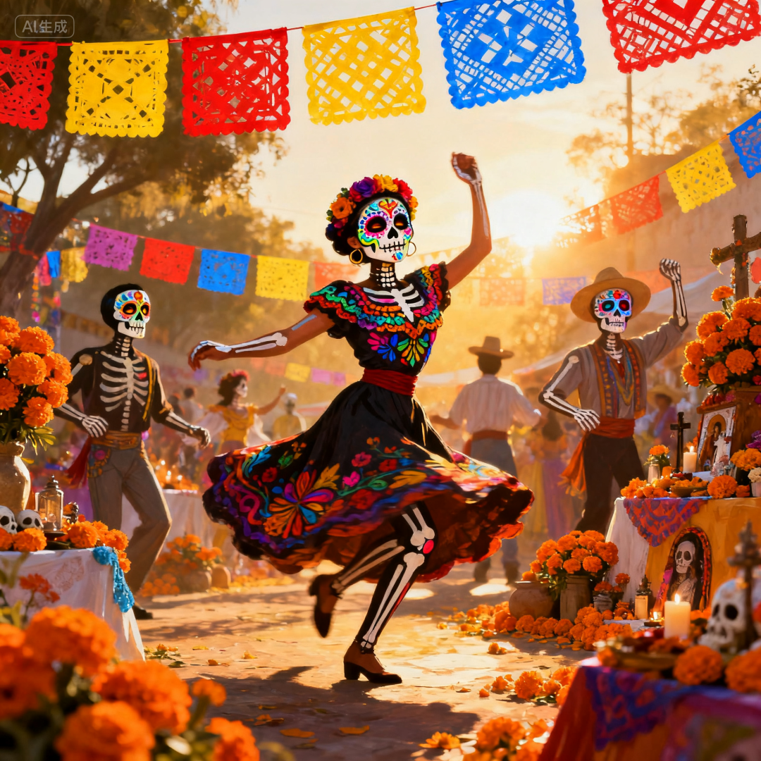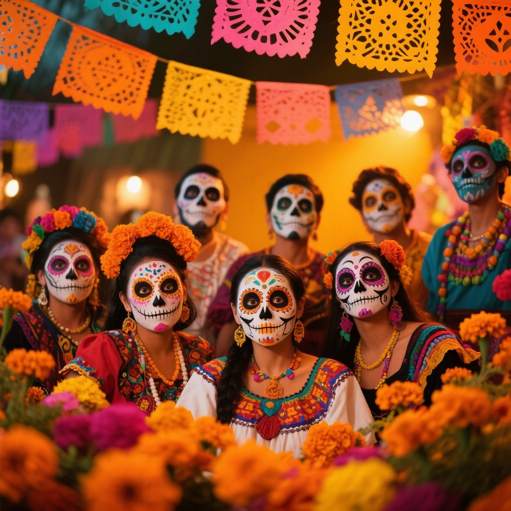 prompt1:一个充满节日气氛的墨西哥亡灵节庆典,有着充满活力的糖颅骨脸部彩绘、多彩的剪纸装饰以及传统的万寿菊花。