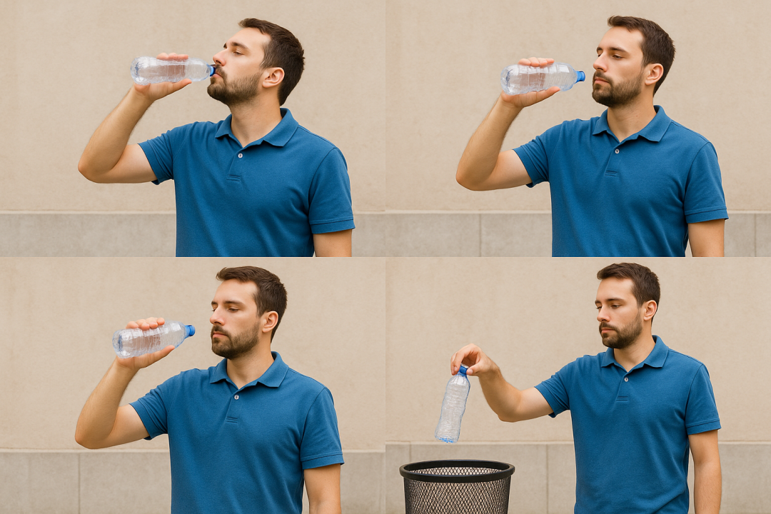 prompt1:生成一组具有顺序关系图片,内容为一名穿着蓝色短袖的男士一口气把一瓶纯净水喝完,最后把空瓶子扔进垃圾桶。