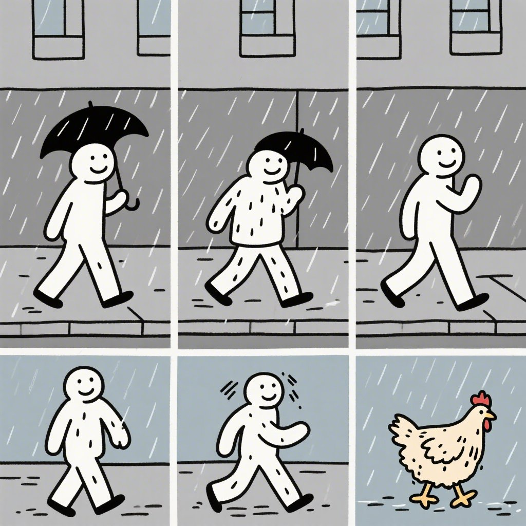 prompt2:生成一组图片,展示一个人走在路上忽然开始下雨了,因为没带伞最终被淋成了落汤鸡,用简笔画风格体现出滑稽搞笑的氛围。