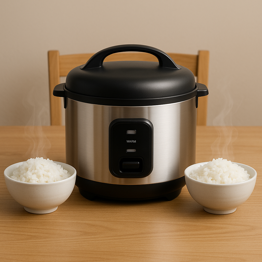 prompt2:餐桌上放着一个电饭煲,它的左右两边各放了一碗冒着热气的白米饭。