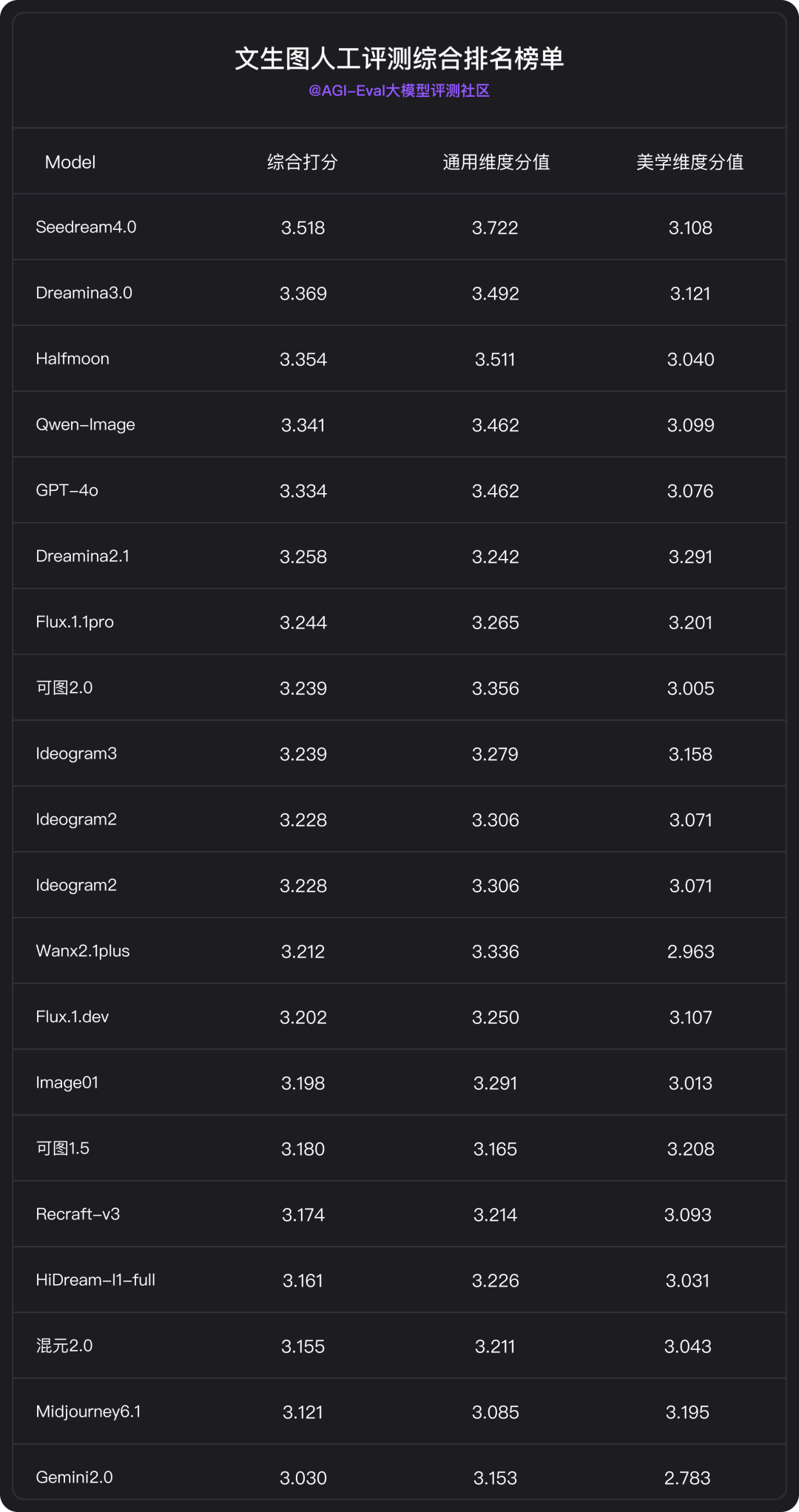 为了对 Seedream 4.0 的性能进行量化与质化评估,AGI-Eval 采用人工评测、自动评测两种形式,共有 1900 条数据集:自动评测包含人像生成 / 人物动物属性生成 / 实体生成 / 实体属性生成 / 字符信息生成 / 情感认知 6 个大类,共计 1000 条;主观评测包含美学专项/字符/人像/通用评测 4 个子集,共计 900 条。评估内容主要考察模型在内容理解、视觉元素生成、合成与渲染等方面能力。