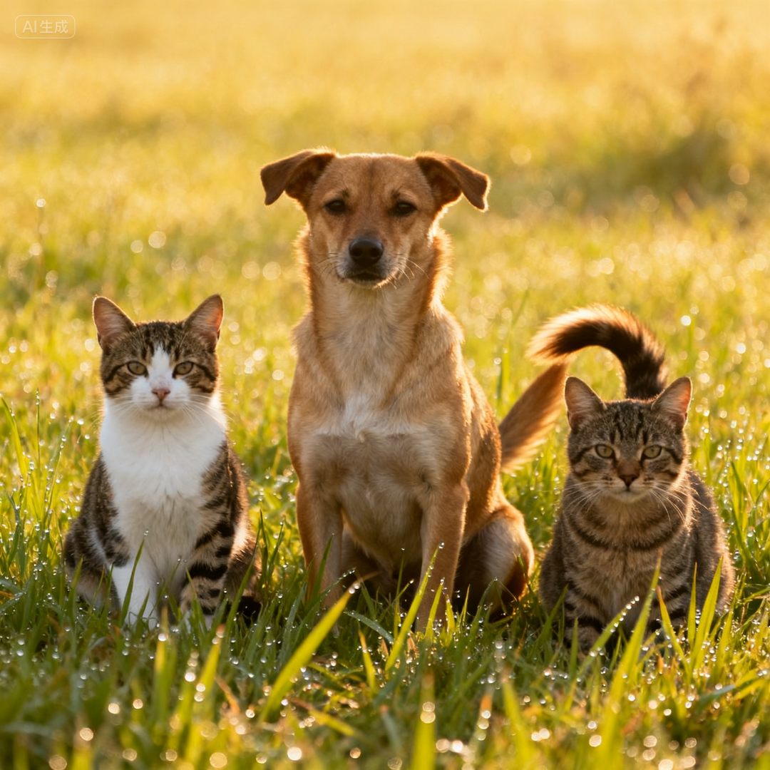 prompt4:两只猫和一只狗正在草地上坐着