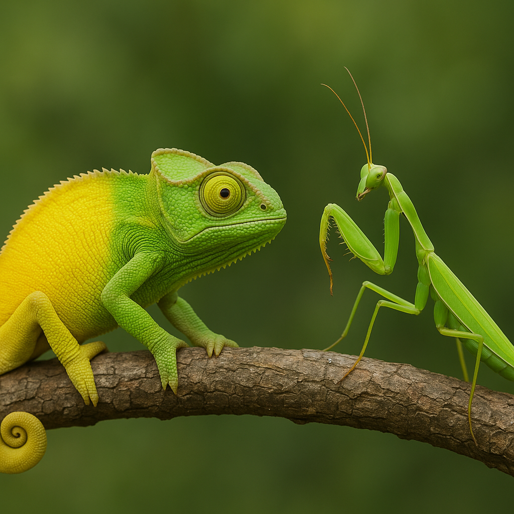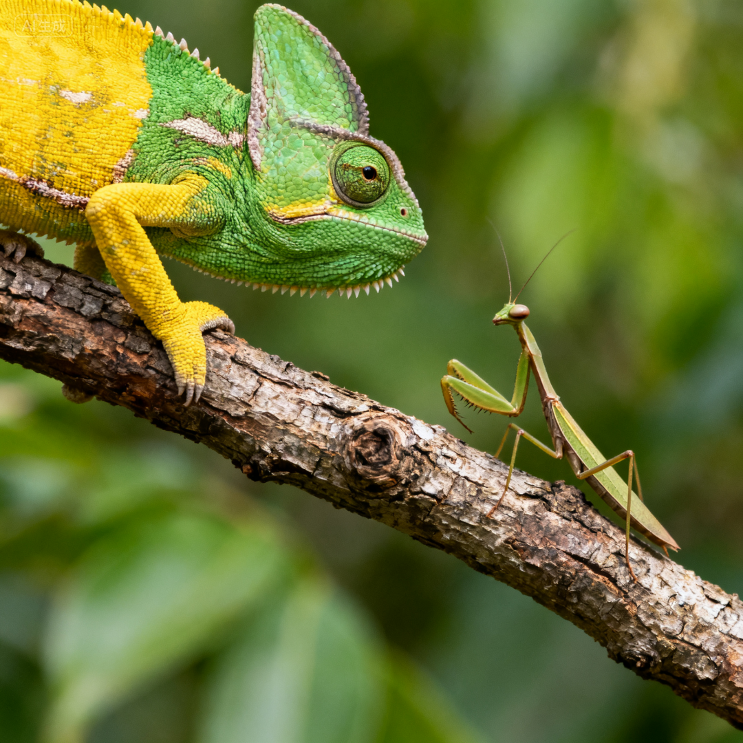 prompt5:树枝上,一只变色龙紧紧地盯着一只螳螂,变色龙的皮肤正在发生颜色变化,原本黄色的身体有一半已经变绿。