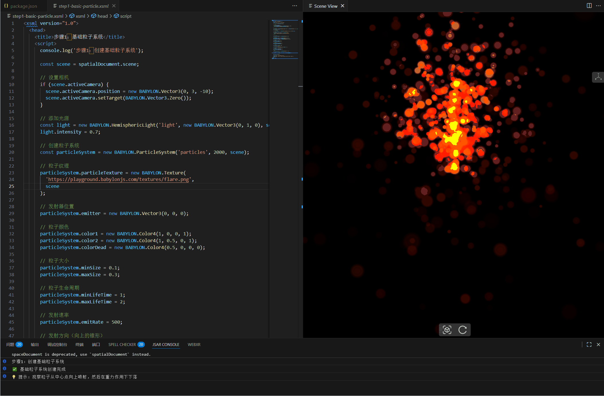 ps.blendMode = BABYLON.ParticleSystem.BLENDMODE_ADD; // 叠加混合(发光效果)目标:创建一个简单的粒子喷泉,理解粒子系统的基本使用。