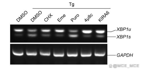 在 3 h Tg 处理之前,将 HeLa 细胞预处理 1 小时环己酰亚胺(CHX,10 μg/mL)。代表性的琼脂糖凝胶显示 XBP1 mRNA 剪接水平的 RT-PCR 分析。
