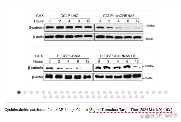 注意事项: 1. 传代次数、细胞状态、细胞密度都可能会影响实验效果。需要调整细胞状态至较好时开展实验 (HCT 116 贴壁细胞形态较小,密度大时容易聚团,铺细胞尽量均匀); 2. 不同细胞系对 Cycloheximide 敏感度不同,检测指标可能有差异,建议参考文献,提前做预实验 (摸索药物处理时间、浓度,抗体条件),确定实验方案合理可行; 3. 药物现配现用,可超声加热助溶,直至溶液澄清透明; 首次实验用不完时需分装冻存 -20℃; 4. 检测指标 MDM2、c-Myc 蛋白出现双条带,可能是发生了翻译后修饰; a. c-Myc存在多种翻译后修饰 (c-Myc 多个位点存在磷酸化修饰、乙酰化修饰、泛素化修饰、糖基化修饰),常出现实际检测分子量与预测条带大小不符,或者两条条带现象[6]。 b. MDM 2 存在多个磷酸化位点,预测分子量为 55 kDa,但由于存在多种异构体和翻译后修饰,以及 p53 激活时对 MDM2 有剪切作用,实测分子量大小为 90 kDa,60 kDa,可能观察到多个条带[7]。
