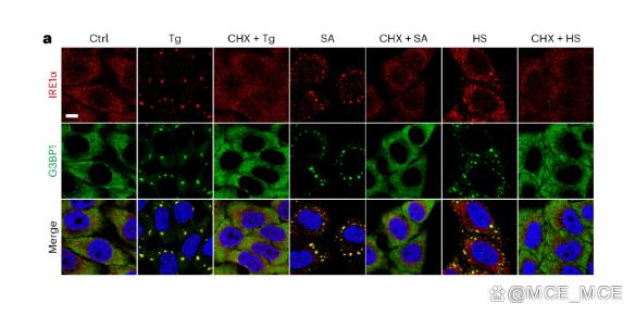 IRE1α簇(红色)与 G3BP1(绿色)共定位在用二甲基亚砜(DMSO)对照(Ctrl),Tg(1μM,3 小时),SA(500μM,1 小时)或 HS(43°C,1 小时)处理的 HeLa 细胞中具有代表性的 IF 图像在没有或存在 CHX(10μg/mL)预处理的情况下。