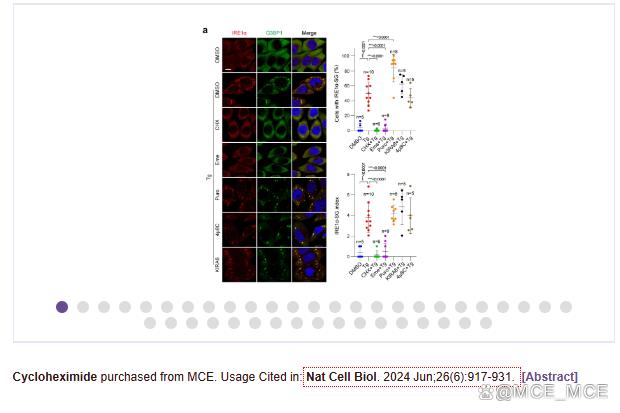 Cycloheximide 与真核细胞蛋白质合成过程中核糖体 60S 亚基的 E- 位点结合,阻断 eEF2 介导的核糖体易位过程并阻止新蛋白质的合成。Cycloheximide 可抑制铁死亡 (ferroptosis) 并抑制自噬 (autophagy)。Cycloheximide 别名:放线菌酮; Actidione; Naramycin A