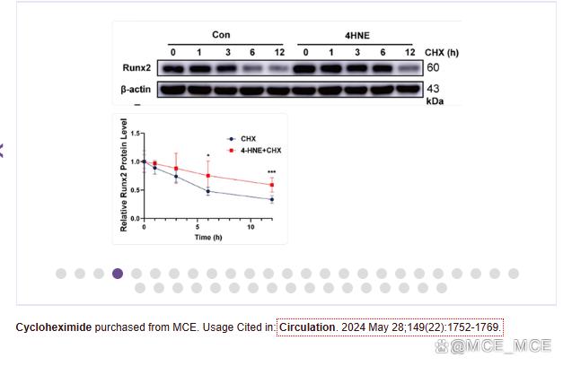 用 4-HNE 和 CHX(100μg/mL)处理的 mVSMC 中 Runx2 水平的蛋白质印迹分析长达 12 小时(n = 9)。