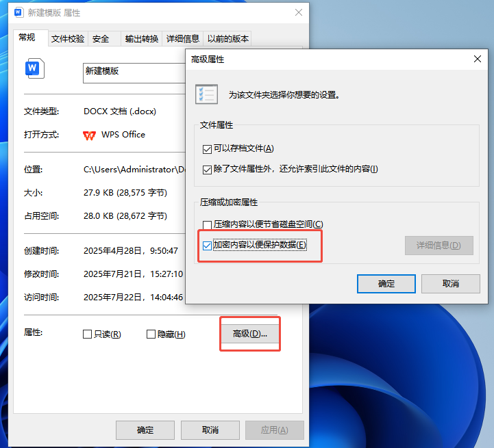小贴士:加密后,建议立即备份加密证书。操作路径:控制面板 > 用户账户 > 管理您的凭据 > 备份您的加密证书。否则重装系统后可能无法打开加密文件。