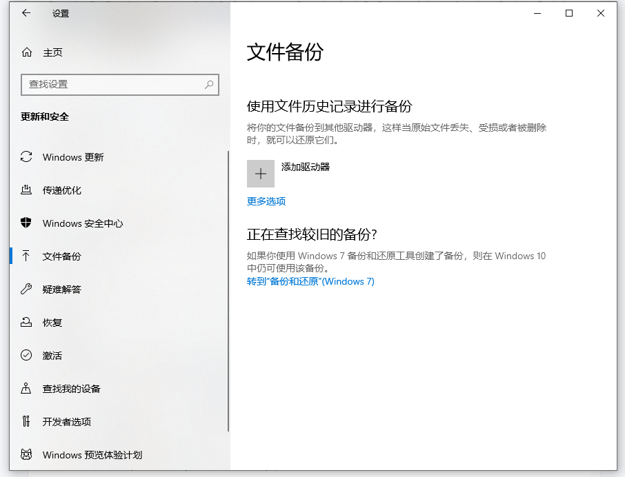 在“使用文件历史记录来备份”下,点击【添加驱动器】。