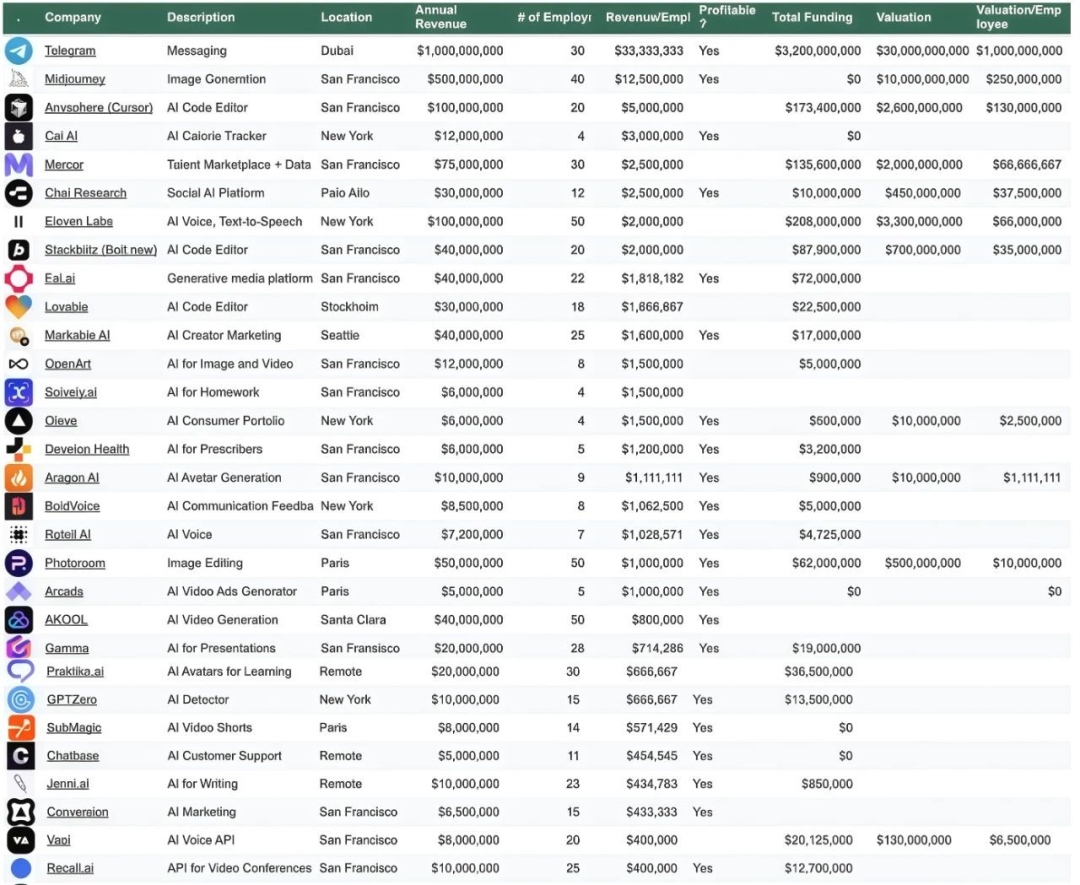 一些善用AI的极简团队正在创造惊人的财富效应。Midjourney用两年时间、约40名员工的团队,创造了约2亿美元的营收;而更年轻的Cursor仅用一年时间、约20名员工,就实现了约1亿美元的营收。事实上,带来产业震撼的Deepseek,其团队规模也只有一两百人。
