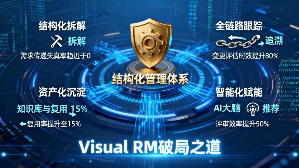 Visual RM 平台的需求结构化管理,不仅是对传统需求管理模式的颠覆,更是企业数字化转型的 “基础设施”。其通过将零散需求转化为标准化、可跟踪、可复用的数字资产,解决了 “需求找不到、看不懂、信不过、用不上、管不了” 的核心痛点,实现了 “业务与科技对齐、战略与执行对齐、成本与价值对齐”。