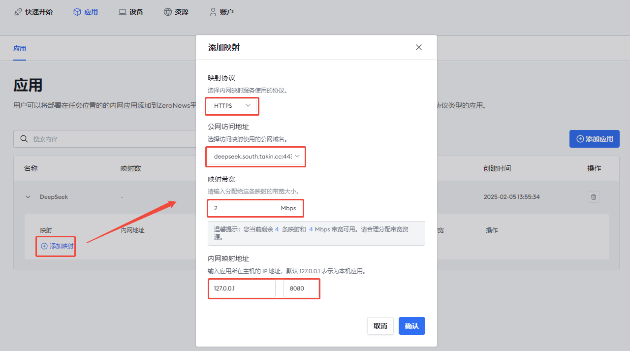 然后在 DeepSeek 应用下,添加HTTPS公网映射