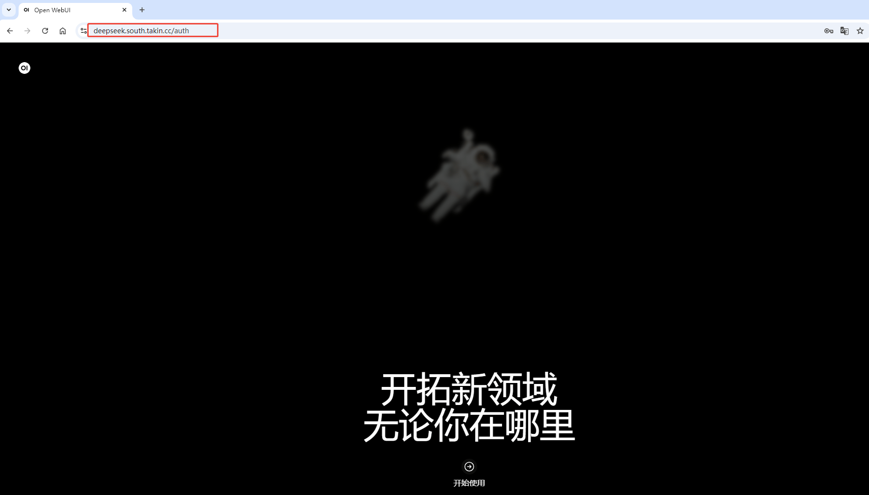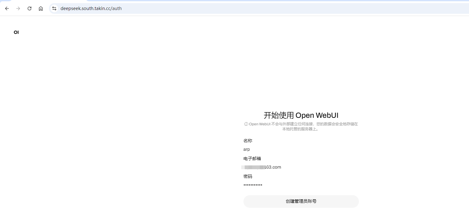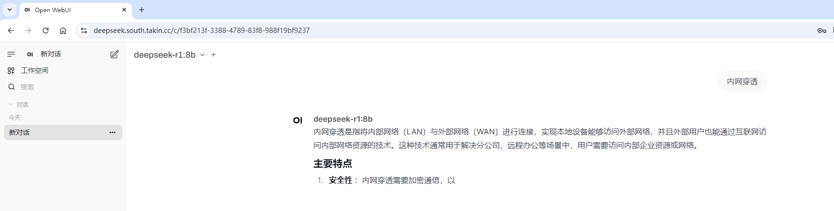 Open WebUI 的公网映射添加完成后,在浏览器就可以通过分配的域名 https://deepseek.south.takin.cc 在公网上访问 Open WebUI 应用平台