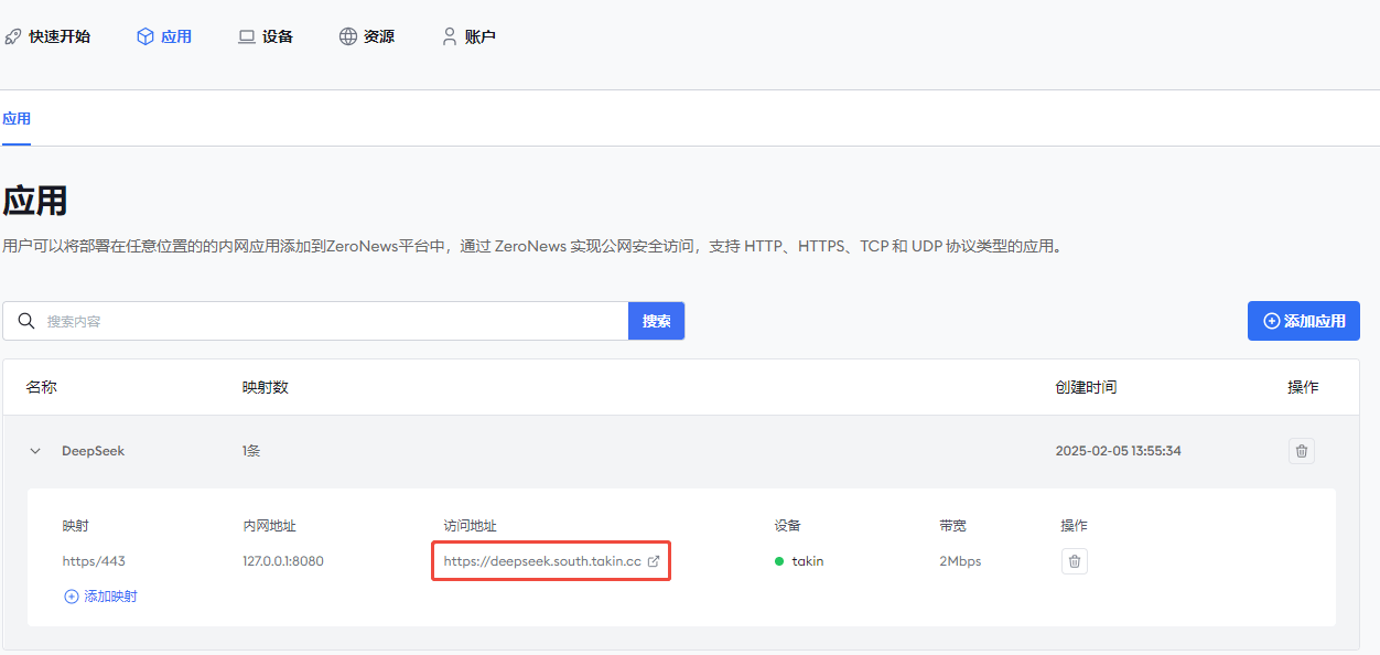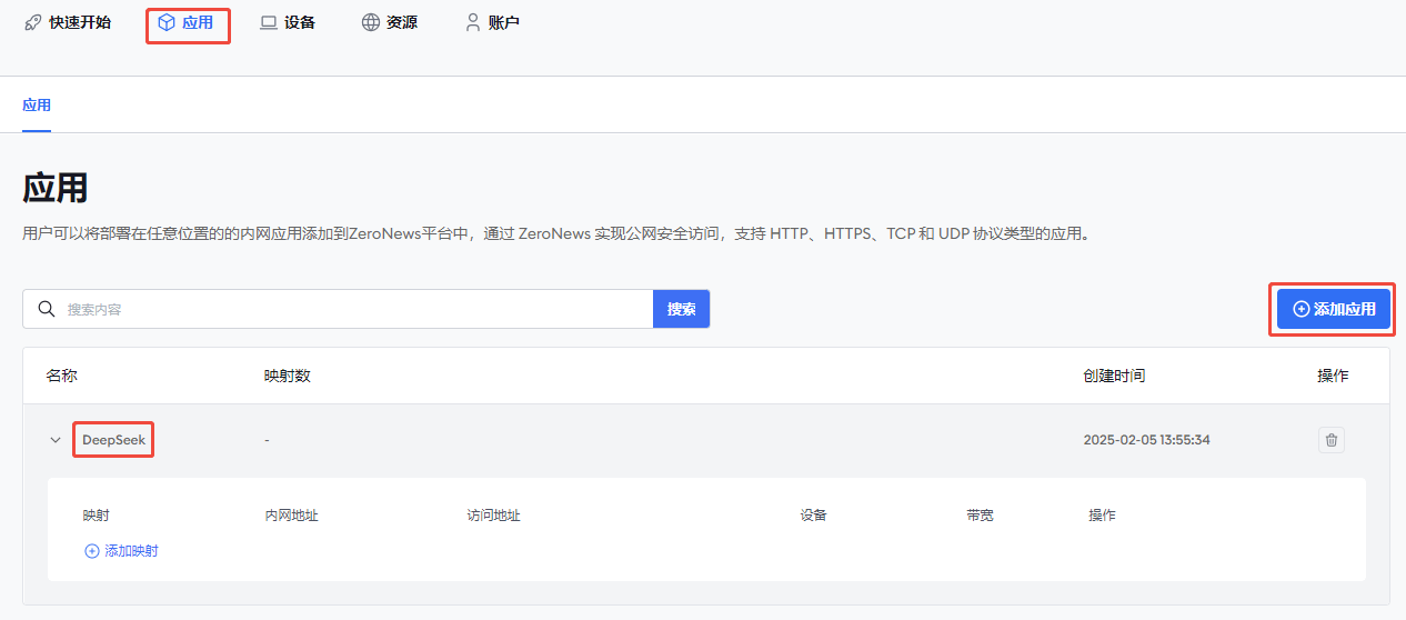 2. 首先在 ZeroNews 管理平台的 "应用" 管理界面下,添加应用,如添加 DeepSeek 应用