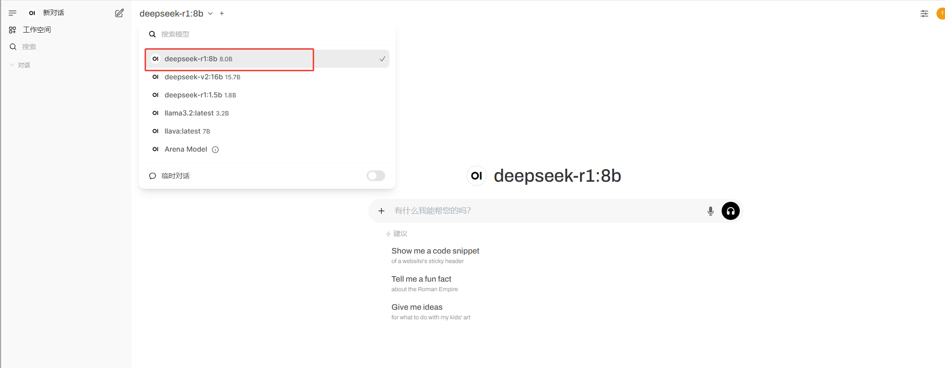 点击 "选择一个模型", 选择我们添加好的 deepseek-r1.8b 模型