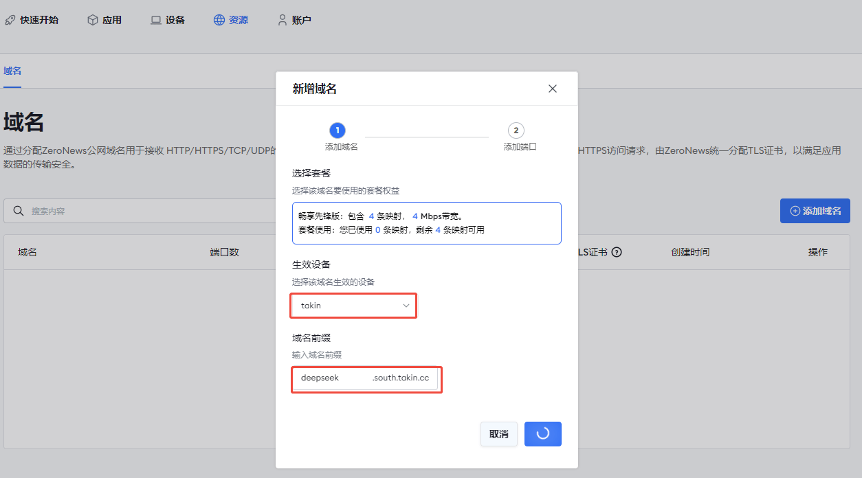 1. 在 ZeroNews 管理平台的 "资源" 管理界面下,添加域名,如添加 deepseek 域名