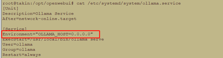 修改 ollama 的本地监听IP地址, 将 Environment="OLLAMA_HOST=0.0.0.0" 添加到 ollama 的系统服务文件( /etc/systemd/system/ollama.service)中