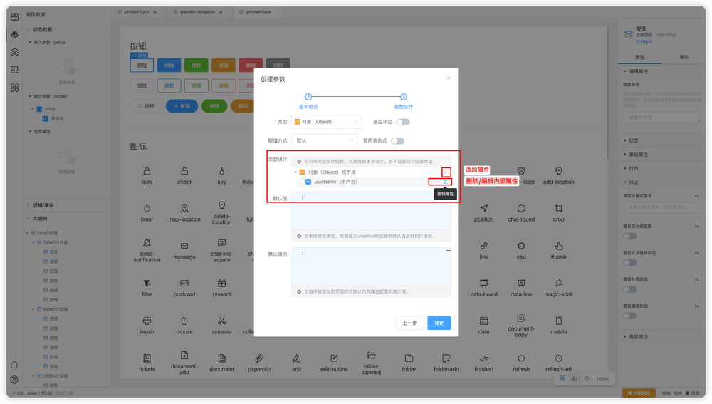 我们可以在内部私有属性面板右侧的加号来打开参数创建面板,在创建属性面板中我们可以配置参数的名称、备注、类型、默认值、演示值。属性创建教程,请阅读本章最后属性/参数创建和编辑小结。