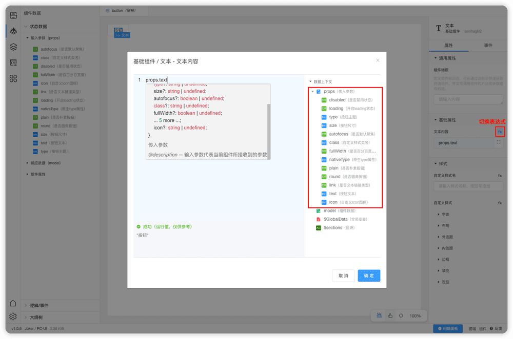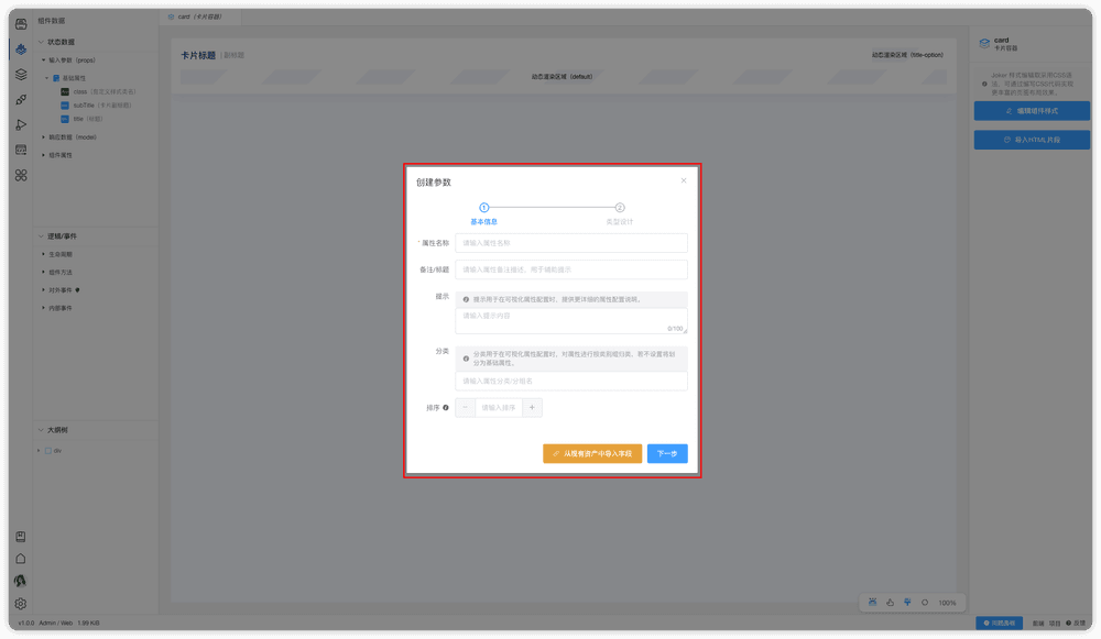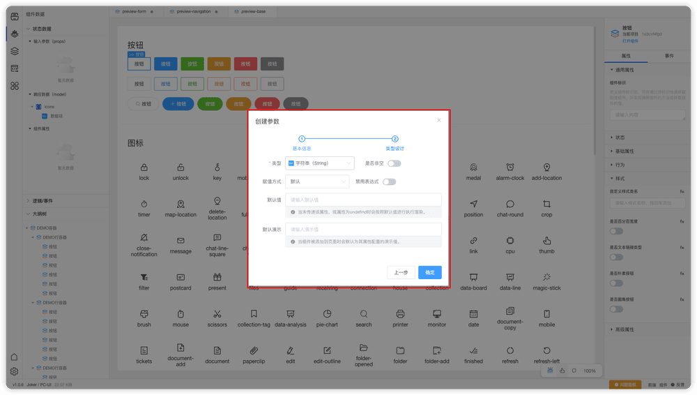 我们可以在输入参数(props)面板右侧的加号来打开参数创建面板,在创建参数面板中我们可以配置参数的名称、备注、类型、默认值、演示值。属性创建教程,请阅读本章最后属性/参数创建和编辑小结。