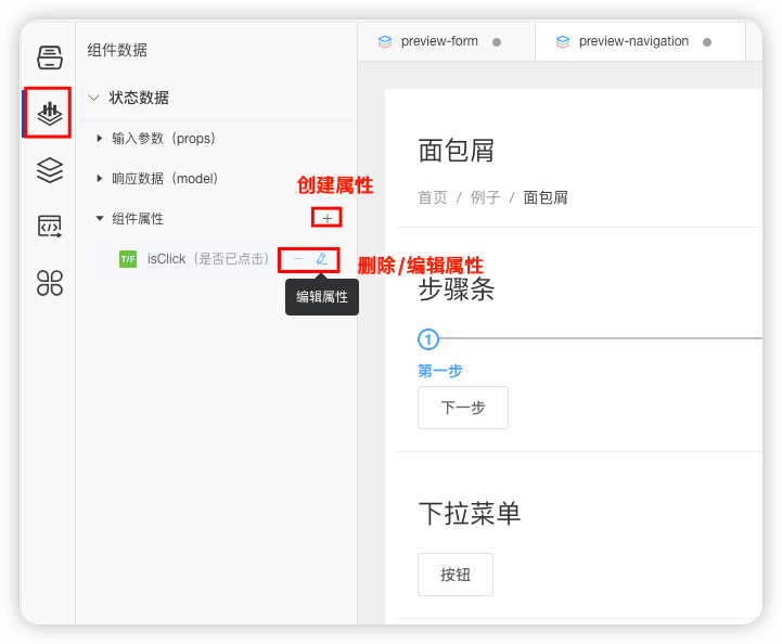 当打开一个组件或页面文件时,工作台左侧菜单中会显示组件数据菜单,点击后即可打开组件数据面板。