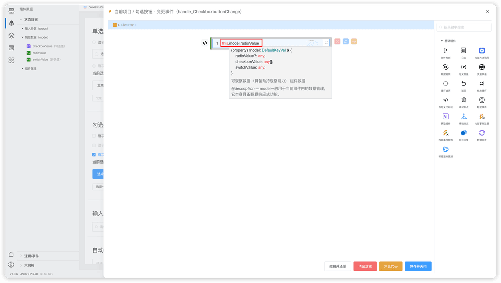 this.model. 的方式读取组件参数值。