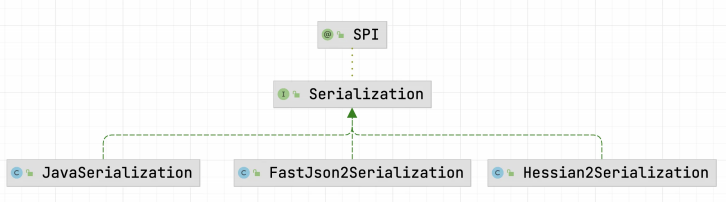 这里可以看到序列化接口有三个实现类,分别是基于jdk,fastjson2和hessian2的三种方式.下面一一说明三种类型的实现方案: