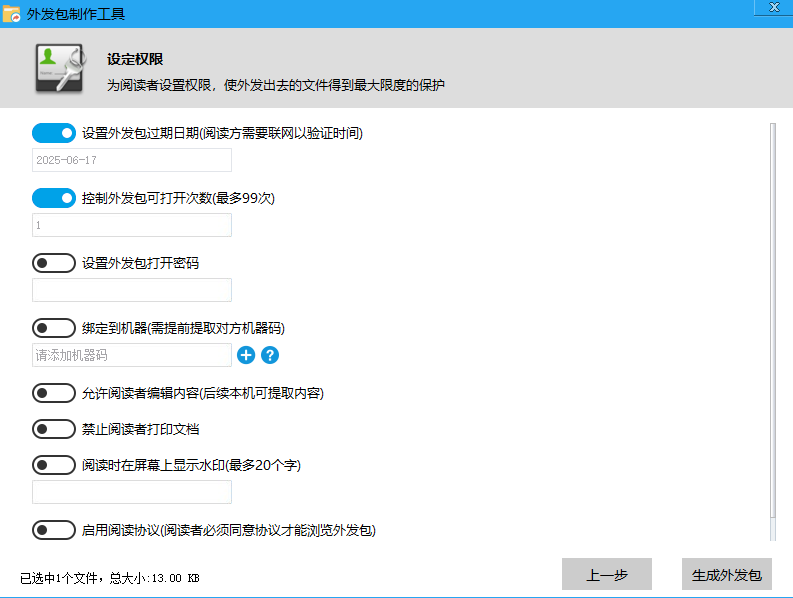 对于外发的文件外发包,可进行细致的权限设置。能限制文件的打开次数和天数,超过设定范围文件将无法打开;还可禁止打印功能,防止文件被私自打印传播;同时可设置打开密码,只有输入正确密码才能访问文件,多维度保障外发文件的安全。