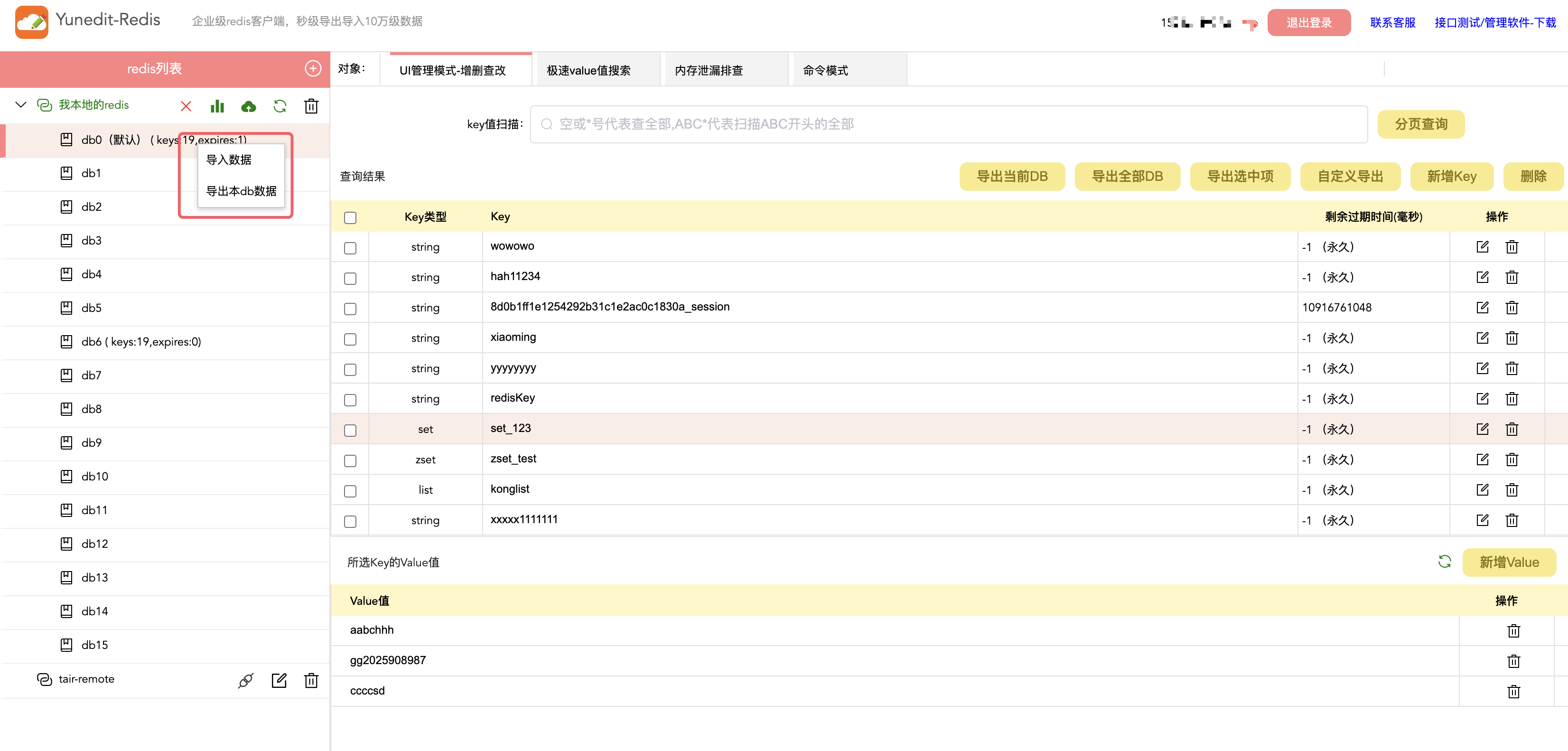 使用方法就是在redis实例的db下,右键点击db,在弹出的菜单中选择导入或者导出就行了,如下图所示: