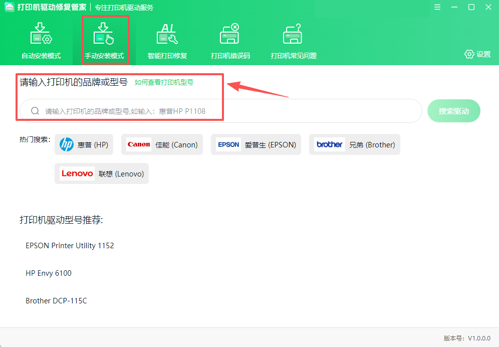 如果自动安装模式下没有检测匹配打印机驱动,可以进入【手动安装模式】,通过输入打印机品牌或型号,检测打印机驱动;点击【下载安装】,跟着提示完成操作即可。