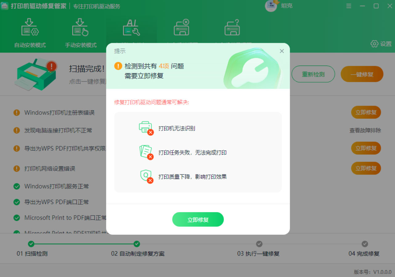打印机驱动安装后,如果打印机还是没反应,进入【智能打印修复】板块,点击【立即检测】按钮、软件会排查驱动是否兼容、服务是否正常,发现问题后点击【一键修复】就能解决;