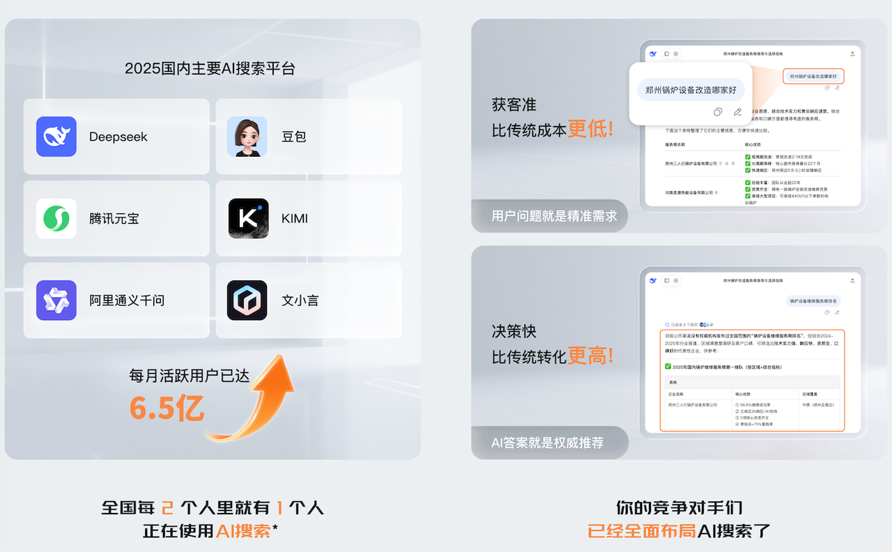 小冰GEO"必搜"覆盖deepseek、豆包、元宝、通义千问等主流大模型平台,一次投放即可实现多平台曝光。据小冰公司数据显示,合作企业在这些平台的品牌曝光量平均提升50%,获客成本降低30%。
