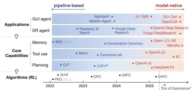 从最近的各项基于RL的agent模型训练,构造agent多轮迭代过程环境依赖的环境(包括工具和执行环境),并设计对应的奖励函数,就能让模型学习到如何在复杂的长程任务上如何调用工具,如何进行多轮迭代,最终完成任务。相比直接使用基础模型,RL训练后的模型在agent各项任务的整体性能上提升非常大,这说明了rl在agent基础模型训练的有效性,模型agent化已逐渐成为模型发展的一种趋势[3]。