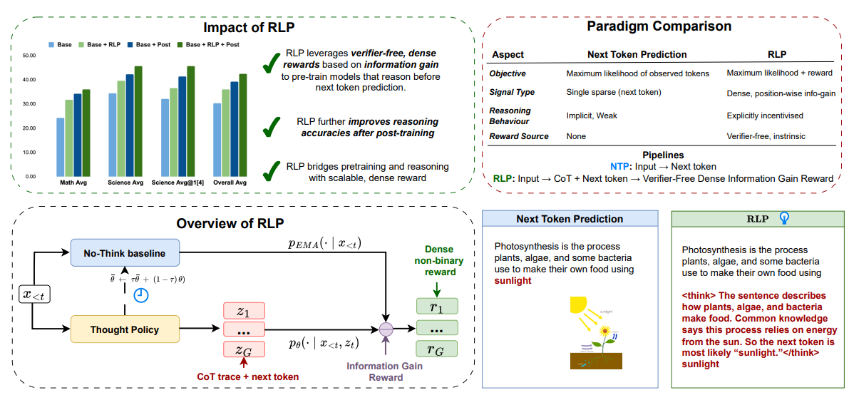 但是针对这两个问题也有一些解决思路,针对预训练,现在有一些研究开始尝试RLP[4](Reinforcement as a Pretraining Objective),RL 前移到预训练阶段,把“下一个 token/片段是否正确”当作可验证奖励,进行规模化强化学习训练,但是算力要求和环境要求都还存在很多工程化挑战。而对于RLVR的可验证局限性,有研究提出rubrics奖励的方法[5],从严格二元奖励扩展到多维度奖励,扩展到更多场景。但有效应还没得到广泛验证,落地更需时间。