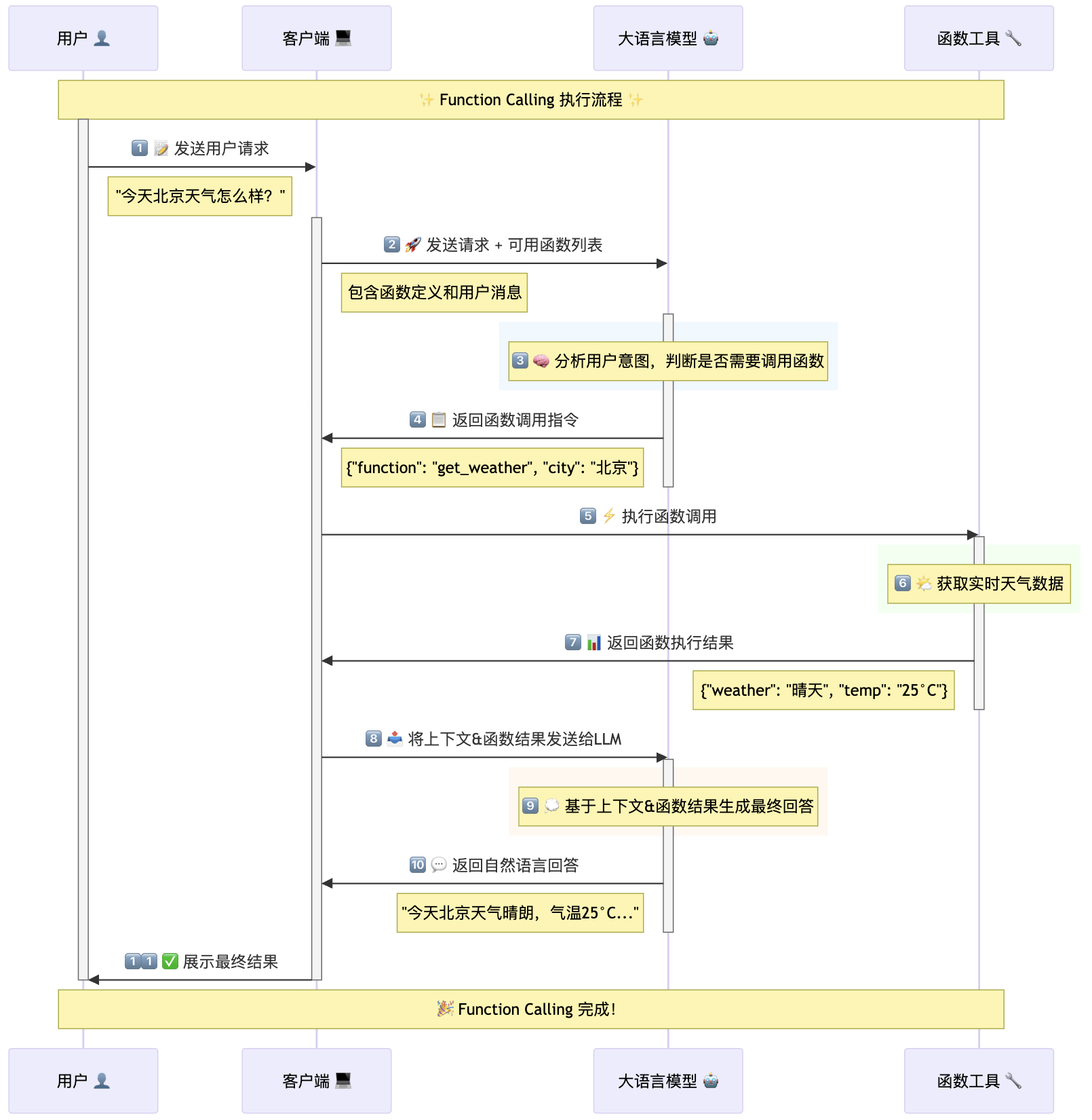 其实上图已经很清晰了,这里不再赘述。实际上在一些复杂场景,LLM 可能会进行多轮函数调用,也就是说会重复上图中 4-10 的过程,直到获取到所有必要信息。举个简单例子,假设我不是查询今天北京天气,而是查询 10 天前北京天气,这个时候 LLM 需要先调用时间工具获取 10 天前的日期,然后再用日期+城市去获取对应的天气数据,最后根据获取到的天气信息拼接成完整的答案回复用户。