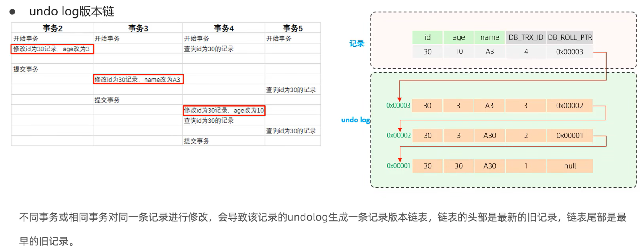 DB_TRX_ID 和 DB_ROLL_PTR。新的 DB_ROLL_PTR 会指向这个刚刚存入 Undo Log 的旧版本。然后才在表中修改该行数据,写入新的 DB_TRX_ID 和新的 DB_ROLL_PTR。因此,通过 DB_ROLL_PTR 指针,一行数据的所有历史版本(快照)被串联成一个链表,这个链表就存放在 Undo Log 中。这个链表称为 版本链。链表的头节点是当前的最新记录。