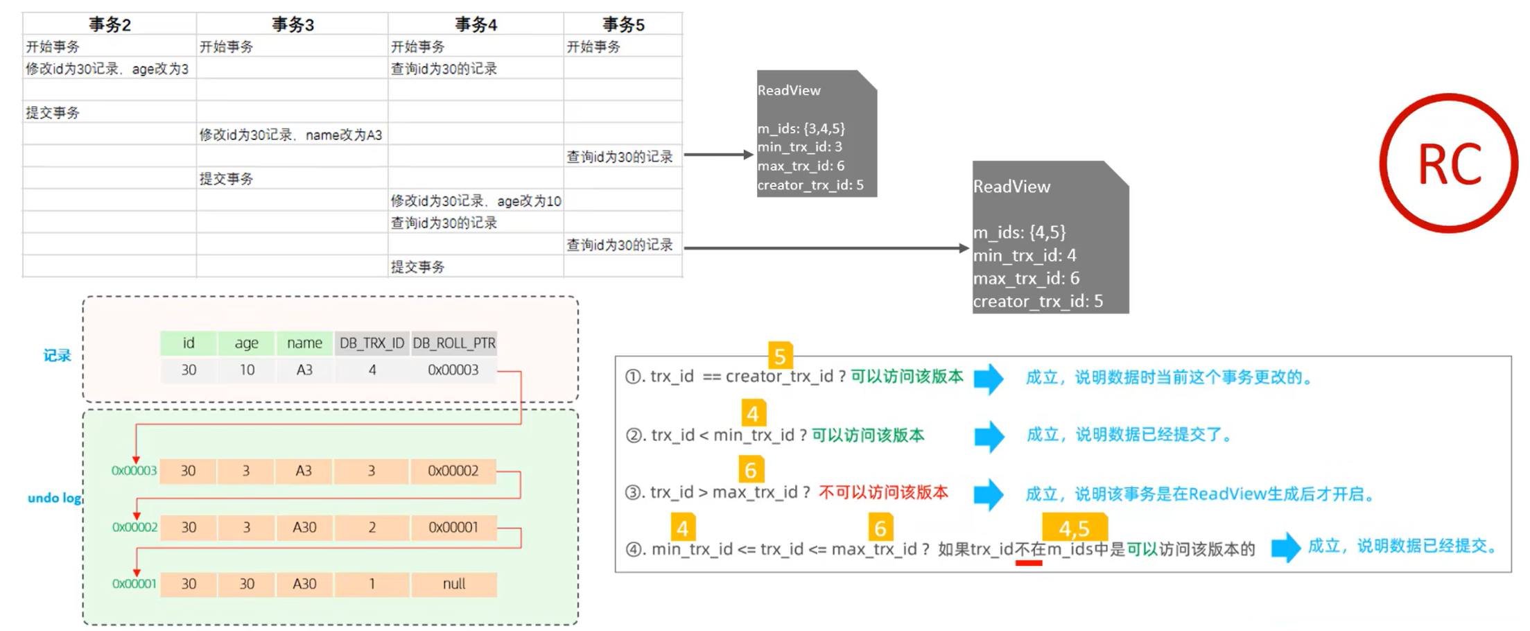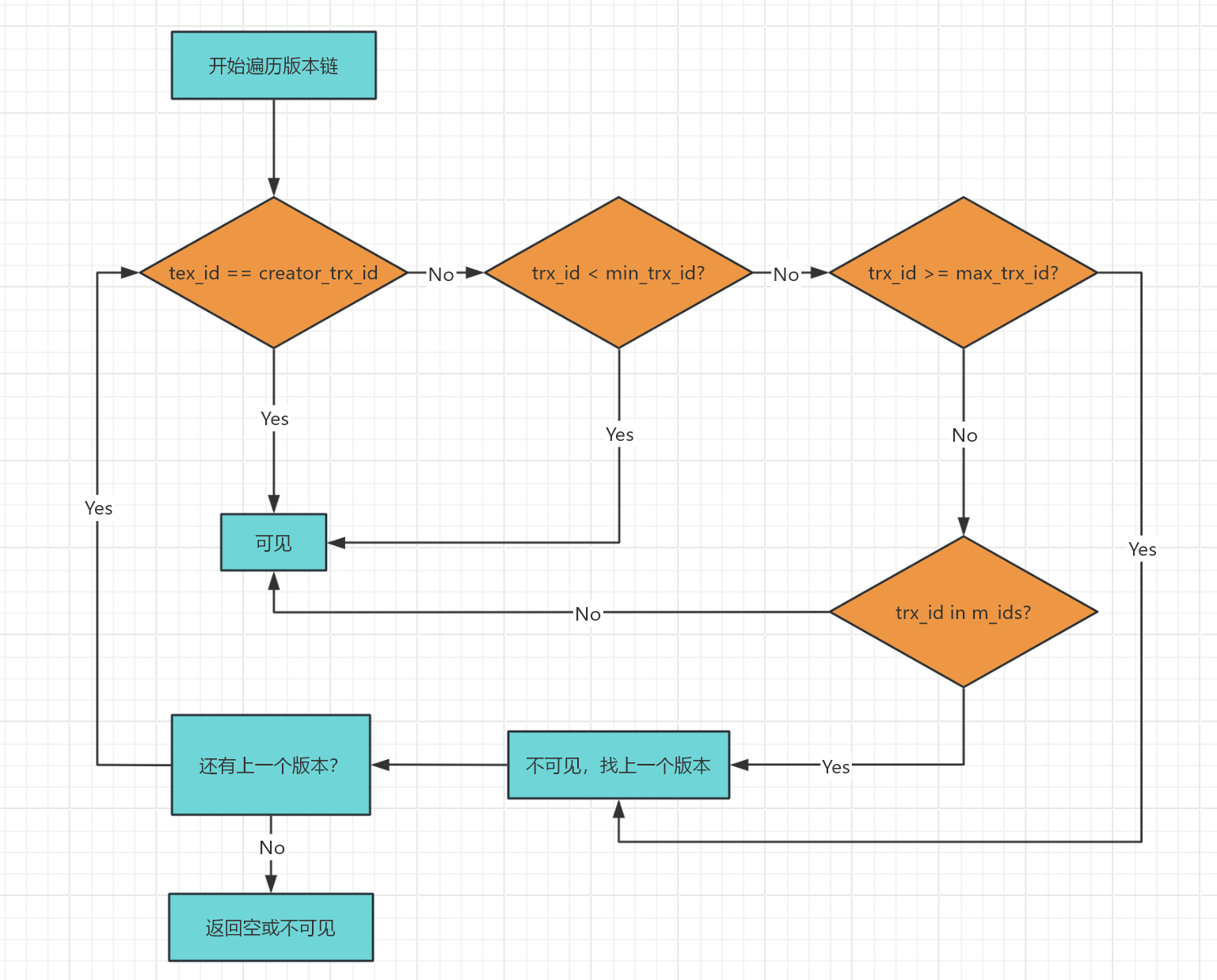 DB_TRX_ID 和 DB_ROLL_PTR。判断流程图: